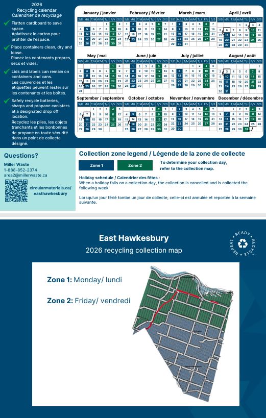 As of July 1, 2023, Circular Materials, a non-profit organization dedicated to creating efficient recycling systems is responsible for the Township of East Hawkesbury's blue box recycling program. Their contractor, GRS Sanitation, will collect recycling throughout the Township each week. This new program is a provincial effort to create a more consistent and efficient blue box service that will reduce waste and allow more materials to be recycled in more communities. For more information on this program, visit their website, Circular Materials.